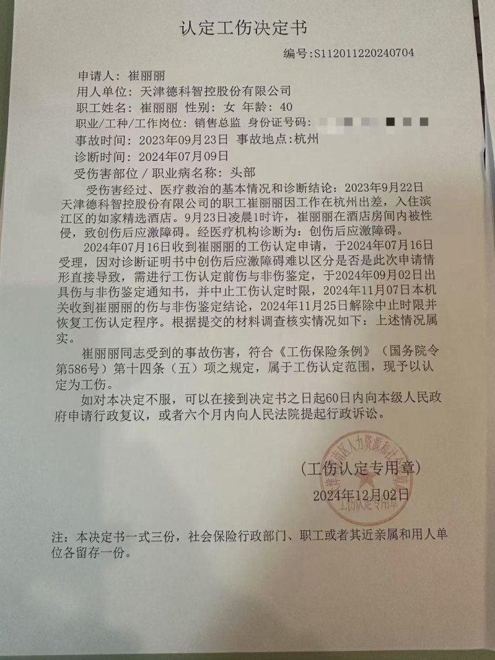 因不服工伤认定,公司方于2025年1月,提起行政诉讼。2025年7月,天津市津南区人民法院审理后,驳回涉事公司的诉讼请求,对崔丽丽受到的伤害认定为工伤。8月,崔丽丽通过社交平台称,涉事公司未在规定时间内提起上诉,意味着此前的法院判决已生效,她所受的伤害被认定为工伤。她表示,维权是一个去污名化的过程,希望有类似遭遇的女性,抛弃内耗,勇敢维权。据潮新闻8月21日消息,崔丽丽案为国内第一例获工伤认定的职场性侵事件。