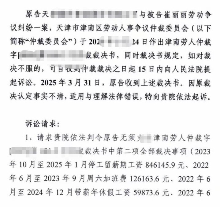 9月10日,崔丽丽告诉潇湘晨报记者,9月23日,她与涉事企业的劳动争议纠纷一案即将开庭。该案因企业不服天津市津南区劳动人事争议仲裁委员会于2025年3月24日作出的仲裁裁决书,作为原告提起的诉讼,企业诉求是希望法院依法判令原告无须支付停工留薪期工资、带薪年休假工资、周六加班费等,起诉书显示,崔丽丽在2023年10月至2025年1月停工留薪期工资为846145.9元。